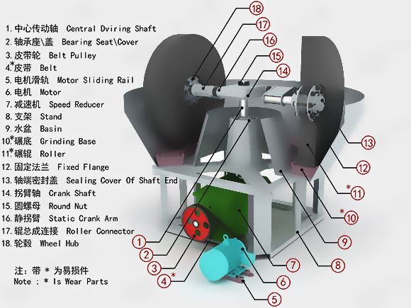濕碾機(jī)主要通過(guò)對(duì)原料的攪拌、破碎、滾壓反復(fù)進(jìn)行后達(dá)到水份均衡、礦漿細(xì)度均勻,從而提高生產(chǎn)效率。濕碾機(jī)主要由機(jī)架、水盆、碾輪、碾盤(pán)、電機(jī)、減速機(jī)等部件組成。