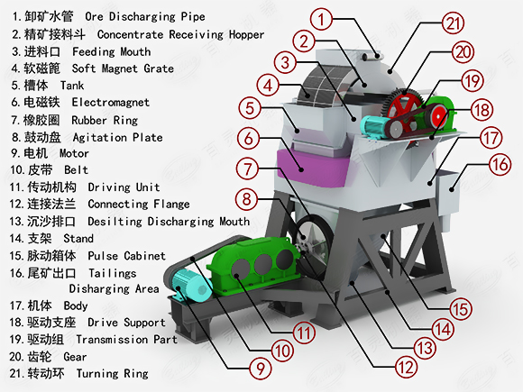 采用特殊的開放式磁路設計,實現(xiàn)了磁場強,磁場作用深度大,磁場梯度合理,具有處理量大、礦物不堵塞、分選效果好等特點。