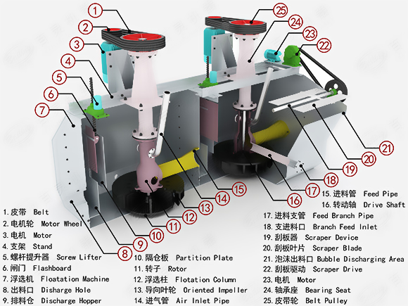 2、葉輪帶有后傾式雙面葉片,可實(shí)現(xiàn)槽內(nèi)礦漿雙循環(huán);前傾式槽體,死角小,泡沫運(yùn)動(dòng)速度快。