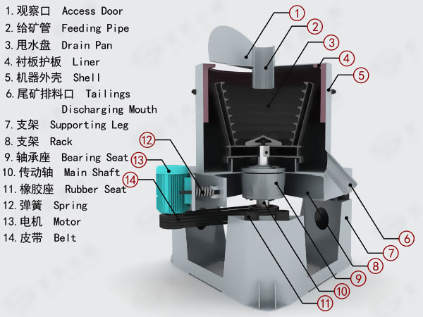選礦離心機(jī)是由給礦管、機(jī)架、尾礦槽、驅(qū)動(dòng)電機(jī)、主軸,反沖水管、精礦排料管,選礦部件等部分組成。