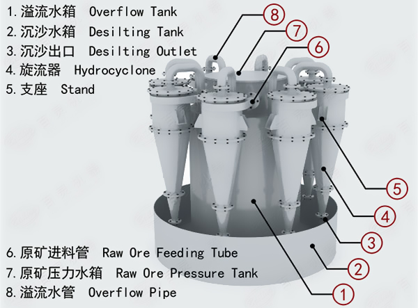 水力旋流器結(jié)構(gòu)設(shè)計(jì)獨(dú)特,采用多段式柱體復(fù)合結(jié)構(gòu),可根據(jù)需要增減柱體高度,若高度增加,溢流細(xì)度提高,可達(dá)10微米左右;并且每個(gè)直徑都有獨(dú)特的筒體長(zhǎng)度和錐角組合,可在最小的總旋流器長(zhǎng)度情況下達(dá)到最大的切線速度,從而增大物料的離心力,提高分級(jí)效率。