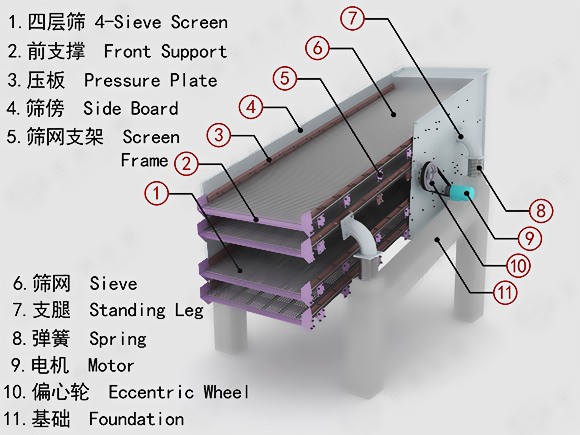 圓振動篩工作時,電動機經(jīng)傳動器使激振器偏心塊產(chǎn)生高速旋轉(zhuǎn)。運轉(zhuǎn)的偏心塊產(chǎn)生很大的離心力,激發(fā)篩箱產(chǎn)生一定振幅的圓運動,篩上物料在傾斜的篩面上受到篩箱傳給的沖量而產(chǎn)生連續(xù)的拋擲運動,物料與篩面相遇的過程中使小于篩孔的顆粒透篩,從而實現(xiàn)分級。